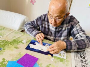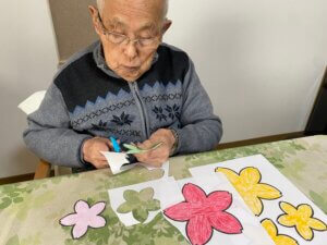花紙をのりでペタペタ貼り、剥がれないようにしっかり押さえながら、貼ったり切ったりと集中して取り組まれていました。