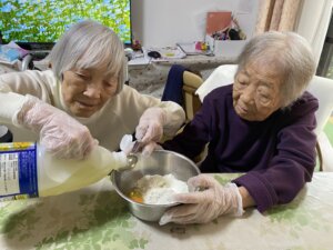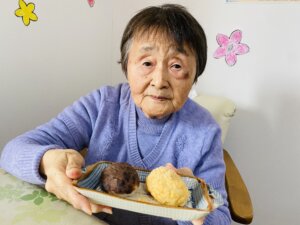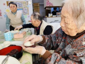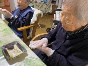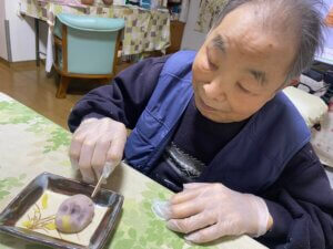 練り切りに挑戦し、「初めてやるわ」「次はどうするんや」と話しながら