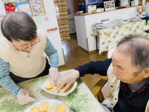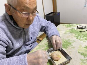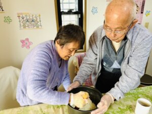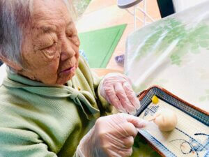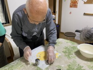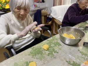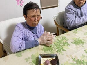 練り切りに挑戦し、「初めてやるわ」「次はどうするんや」と話しながら