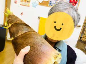さらに、ご利用者様から「俺の竹やぶで取れたよ」「俺が掘ってきたんやぁ」と、立派なたけのこをいただきました✨